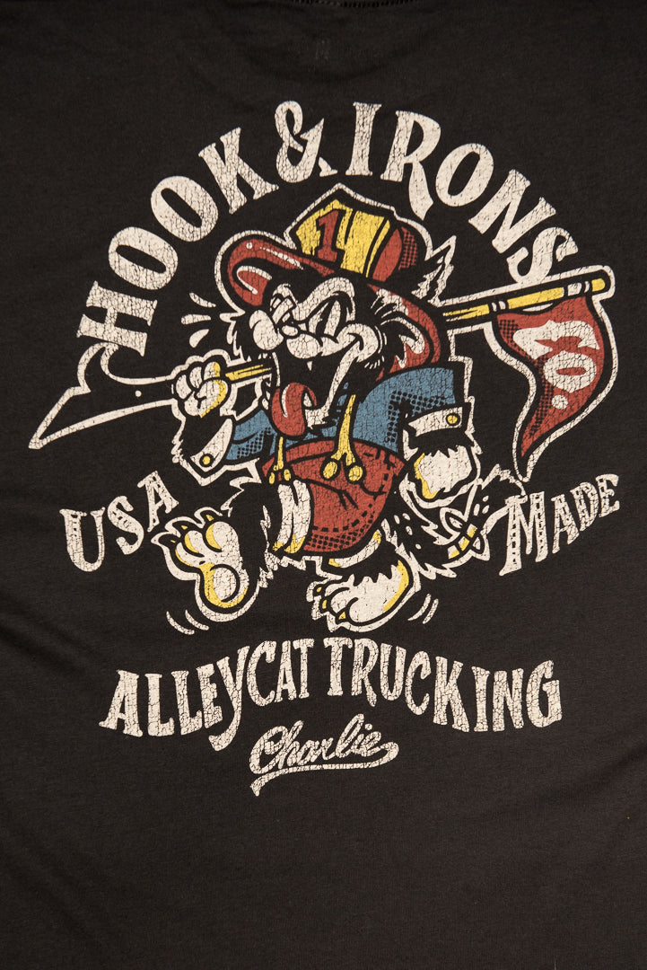 Charlie the 'Alleycat' was created in that vintage 70's Firehouse logo style and printed with waterbase ink on a super soft H&I shirt. Matching Kids Tee here
