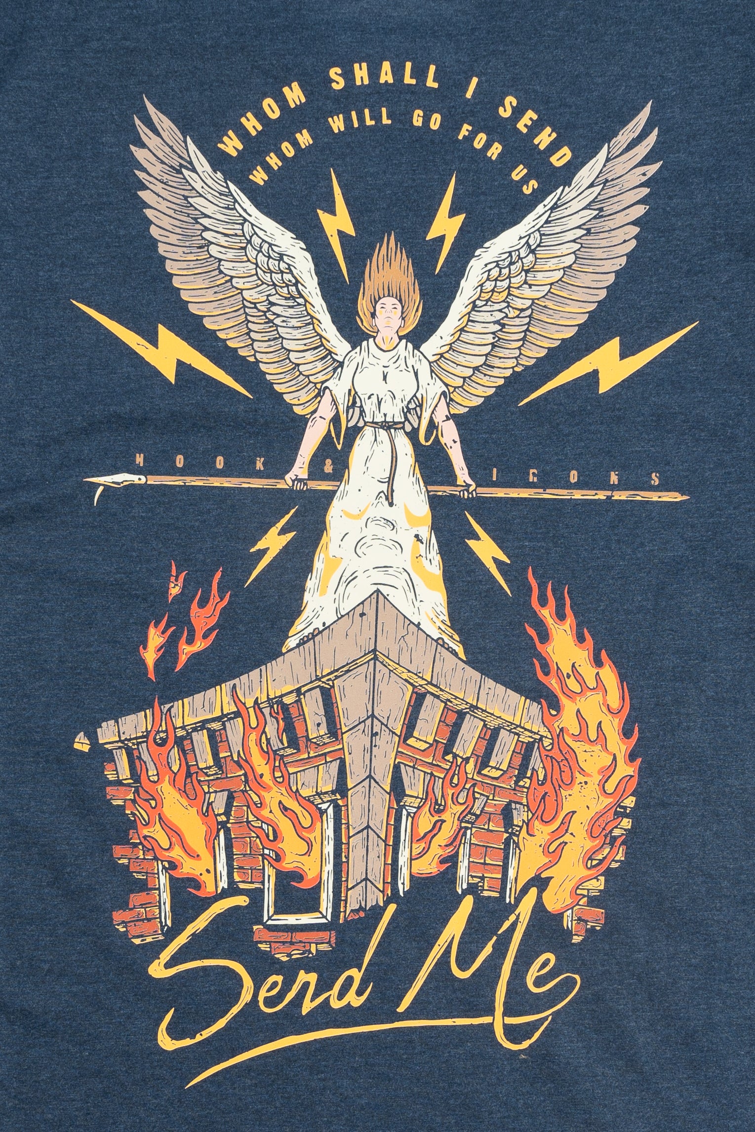 An angel stands over the roof of a brownstone as fire blows out the windows. The imagery guides the eye to the dangers below and you're left to imagine the firefighters who are ascending to the danger. This design was so powerful we decided to release it as a limited edition print. We hope you love it as much as we do.