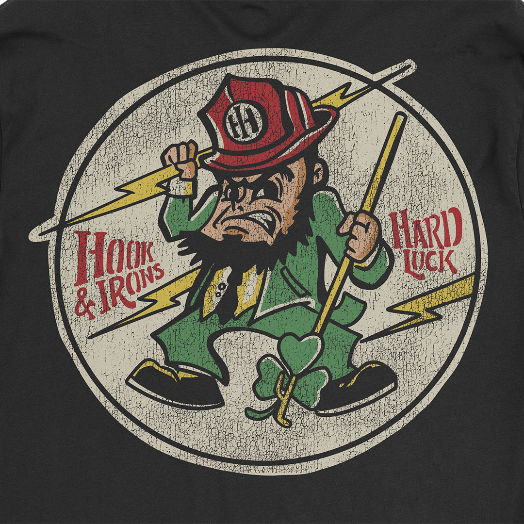 If we didn't have hard luck, we wouldn't have any luck at all. The Limited Edition St. Paddy's tee is an original WWII vintage leprechaun with a shamrock skewered on his NY hook. There ain't no pot o' gold at the end of this rainbow.