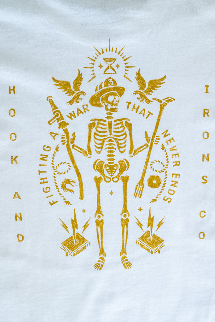 When you join the fire service you agree to fight a war that never ends with an opponent who is always changing. The design highlights some of the tools we use in that fight--a nozzle, halligan, books for education, and a saw blade. All of it rests below an hourglass where time is never on our side.